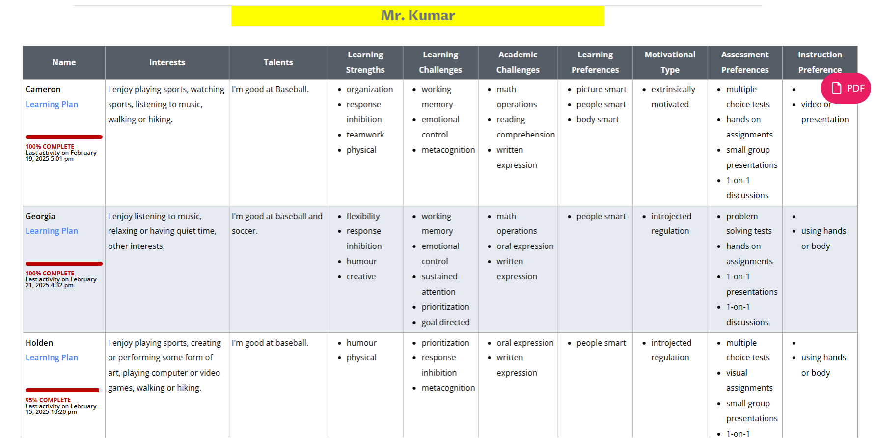 A class profile is a one page snapshot of profiles for all students that the teacher, tutor or educator supports. It provides them with a holistic glance of each student’s strengths, needs, interests, learning preferences and motivational tendencies to help BUILD STUDENT RELATIONSHIPS.